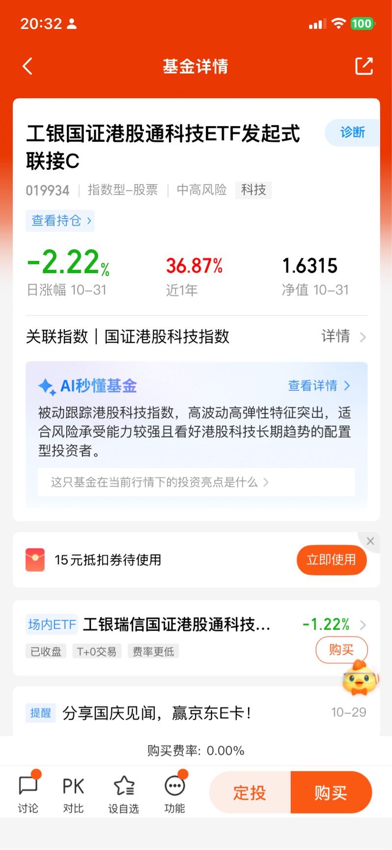 #分享国庆见闻,晒收益,瓜分好礼!# 留言第三十六天,昨天A股和港股都出现了小幅回调。投港股科技,就选$工银国证港股通科技ETF发起式联接C$ ,近一年涨39.23%,在3093只同类基金中排名前列,表现亮眼!个人认为,权益市场短期震荡回调,是逢低布局的好机会。