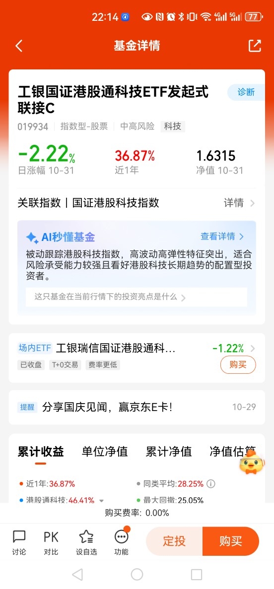 工银瑞信基金公司优秀基金经理赵栩先生管理的工银国证港股通科技ETF发起式联接基金,(A类代码:019933,C类代码:019934)给投资者提供了费率低、方便快捷、高效的投资港股通科技的工具,该基金采用简单的分散化投资哲学,透明的投资思路,较为有效分散投资风险,跟踪误差小、投资效益高,值得期待!