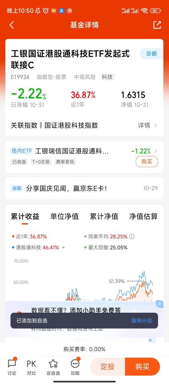#分享国庆见闻,晒收益,瓜分好礼!# 在2025年全球资本市场的复杂博弈中,$工银国证港股通科技ETF发起式联接C$ 凭借其独特的投资逻辑与市场环境的深度契合,持续展现出超额收益能力。其跟踪的国证港股通科技指数不仅在过去三年累计跑赢恒生科技指数120%,更在当前政策红利与产业升级的共振中,成为捕捉港股科技投资机遇的核心工具。