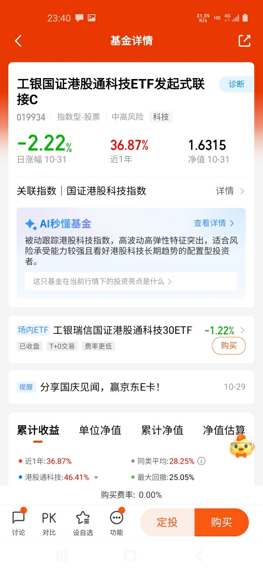 #分享国庆见闻,晒收益,瓜分好礼!# 本月港股科技出现了一波调整,既有外部贸易战的因素,指数内部也有自身高位调整的需求。节前港股科技连续大涨,已经到了易跌难涨的位置,积累大量获利盘。市场一震荡,获利盘想落袋为安,指数到关键阻力位,抛压一大,调整就来了。