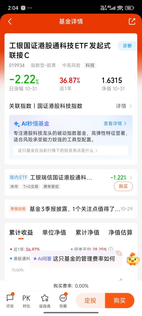 四季度是布局次年行情的关键窗口。我将密切关注“十五五”政策预期方向,尤其是硬科技、循环经济等领域。工银国证港股通科技ETF发起式联接C作为场外基金,无需开户即可投资港股通科技龙头,为我提供了便捷的工具。