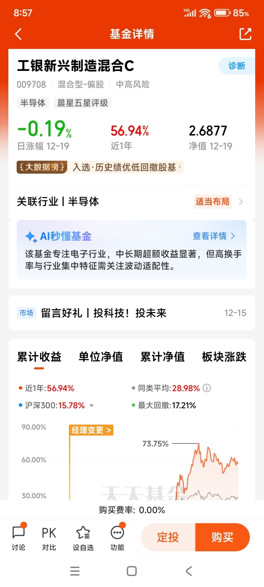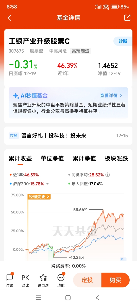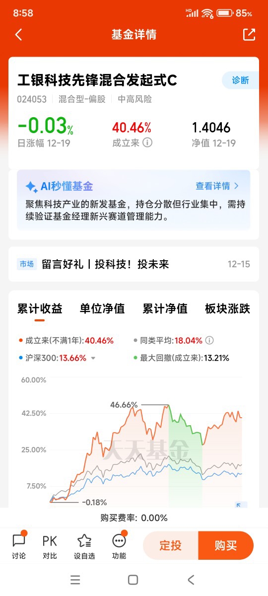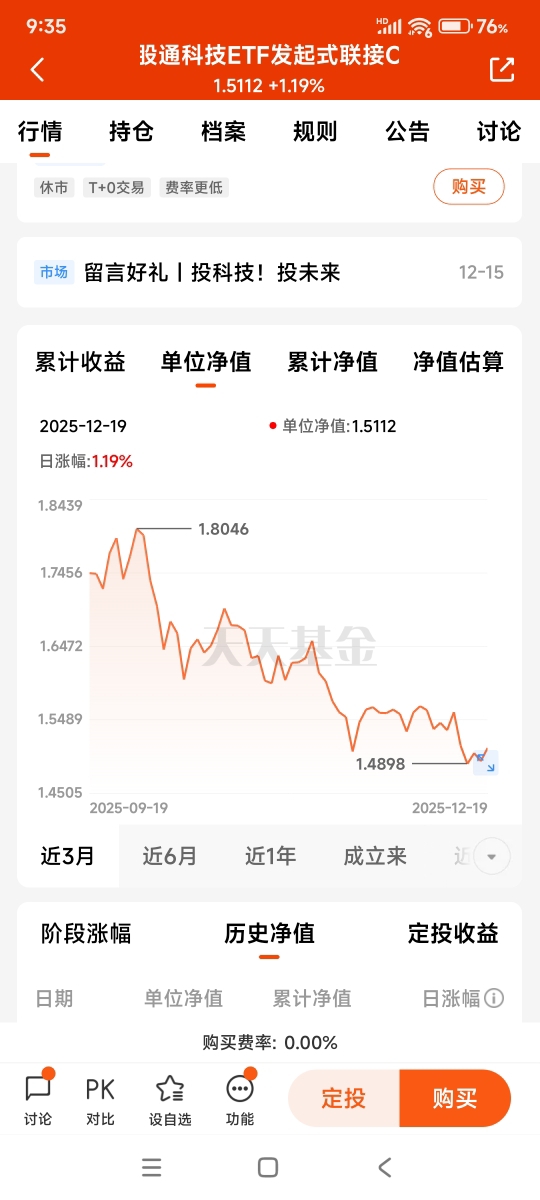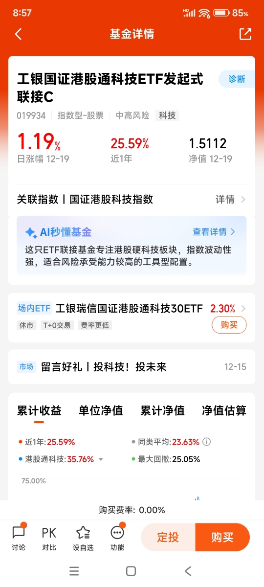 $工银国证港股通科技ETF发起式联接C$近一年涨幅25.59%,最大回撤17.44%。该基金阶段最高净值达1.8046元,2025年12月19日单位净值为1.5112元,近三月最低净值为1.4898元,近三月最大回撤同样为17.44%。我计划若近期收盘前净值估算低于1.4898元,便开始逐步加仓。投资有风险,入市须谨慎!@工银瑞信基金。