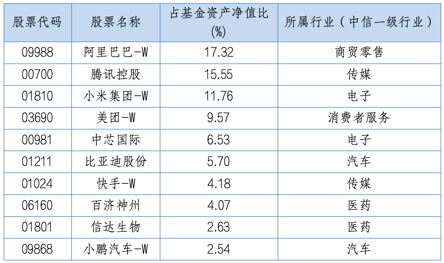 指数成分股集中度高,前十大权重股合计占比近80%,前五大权重股占比约60.24%,包括阿里巴巴-W(18.03%)、腾讯控股(15.27%)、小米集团-W(11.83%)、美团-W(9.10%)、中芯国际(6.80%)、比亚迪股份(5.61%)、快手-W(4.26%)、百济神州(3.52%)、药明生物(2.63%)、小鹏汽车-W(2.52%)等。这种高集中度设计既保证了龙头股的代表性,又通过权重上限设置(单只样本股不超过15%,前五大不超过60%)避免了单一股票对指数的过度影响。