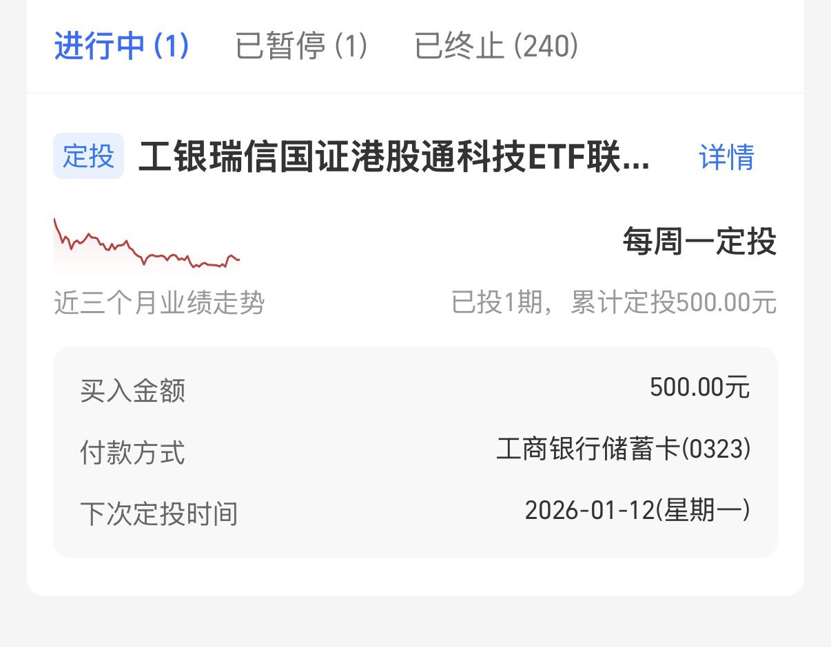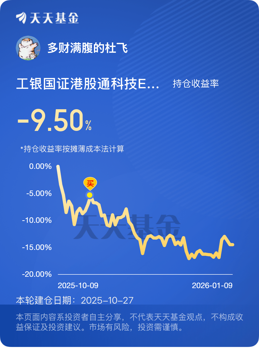 写在最后:港股科技的投资逻辑很扎实——稀缺标的、低估值、双重机会(现在和未来),加上国证港股通科技指数的均衡布局,都让工银瑞信这只基金成为好工具。但大家也别指望着可以一夜暴富;市场在混沌中前行,AI技术渗透率还低,应用生态发展需要时间。用周定投慢慢积累,就像种树一样,等风雨过后,根基深的公司会迎来重估。当前港股整体盈利能力强,互联网、新消费等资产稀缺,长期配置性价比高。我自己坚持定投,就是相信中国科技股的叙事远未结束,未来增长机会依然亮眼。如果你也心动,不妨从工银瑞信国证港股通科技ETF联接基金(019933/019934)开始,用闲钱周周投,耐心等待收获季。投资路上,心态稳了,收益自然来。#晒收益#