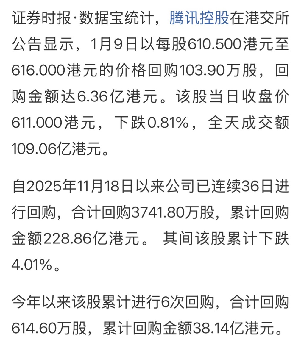 其次,“第二重Buff”更是肉眼可见:港股目前正处于历史性的估值洼地之中,性价比极高。经历了过去几年的深度调整,港股,尤其是其核心的科技板块,估值已经被压缩到了极具吸引力的水平。截止到2025年1月9号,国证港股通科技指数最新的市盈率目前仅为26倍左右,这个数字无论是对比A股的科技板块,还是对比全球其他主要市场的同类板块,都存在着显著的估值折价。这意味着什么?意味着投资者现在有机会以相对低廉的价格,买入代表中国未来增长引擎的优质核心资产。这种巨大的“价格差”本身,就蕴含着未来估值修复的巨大潜力,是未来潜在回报的重要来源之一。港股科技公司自己也看不下去了,开始用真金白银投票。比如腾讯,在2025年初就明确宣布,计划全年回购至少800亿港元的股份。这种史无前例的大规模回购,本身就是管理层认为股价被低估的最有力证明,回购行为也会直接减少市场上流通的股份,对股价形成支撑。当最了解公司价值的管理层都开始大手笔“抄底”自家股票时,市场的悲观情绪或许真的已经到了极致,转机往往就在这种时候孕育。