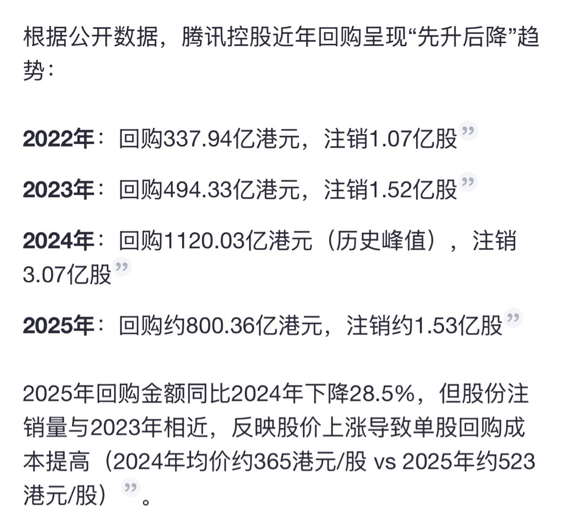 除了宏观层面的逻辑支撑,微观层面的企业行为更能直观地反映出管理者对公司未来的真实看法。当市场陷入恐慌,股价持续低迷时,最了解公司内在价值的管理层,他们的行动是信心的“试金石”。而纵观整个港股科技板块,我们看到的不是恐慌性的抛售或躺平,而是一场由科技巨头们主导的、堪称史上最大规模的自救与信心传递行动——股票回购。其中最典型的例子无疑是腾讯控股。早在2025年年初,腾讯就公布了全年至少回购800亿港元的宏大计划。根据后续的公开报道和公司公告,腾讯不仅坚决执行了这一计划,并且实际回购金额还超过了原定目标,展现了其对自身价值的坚定信心和对股东回报的高度重视 。
