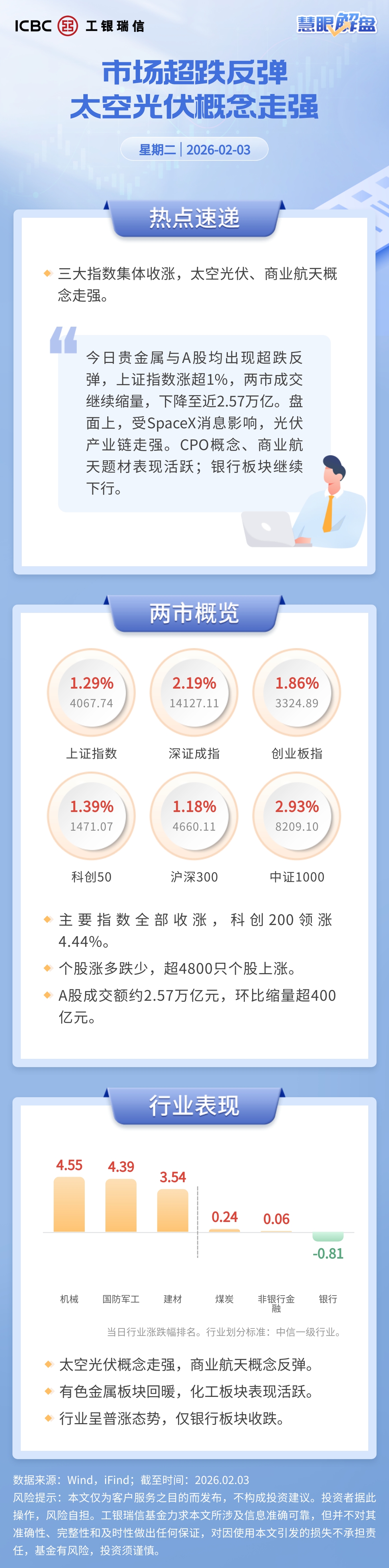 今日贵金属与A股均出现超跌反弹,上证指数涨超1%,两市成交继续缩量,下降至近2.57万亿。盘面上,受SpaceX消息影响,光伏产业链走强。CPO概念、商业航天题材表现活跃;银行板块继续下行。
