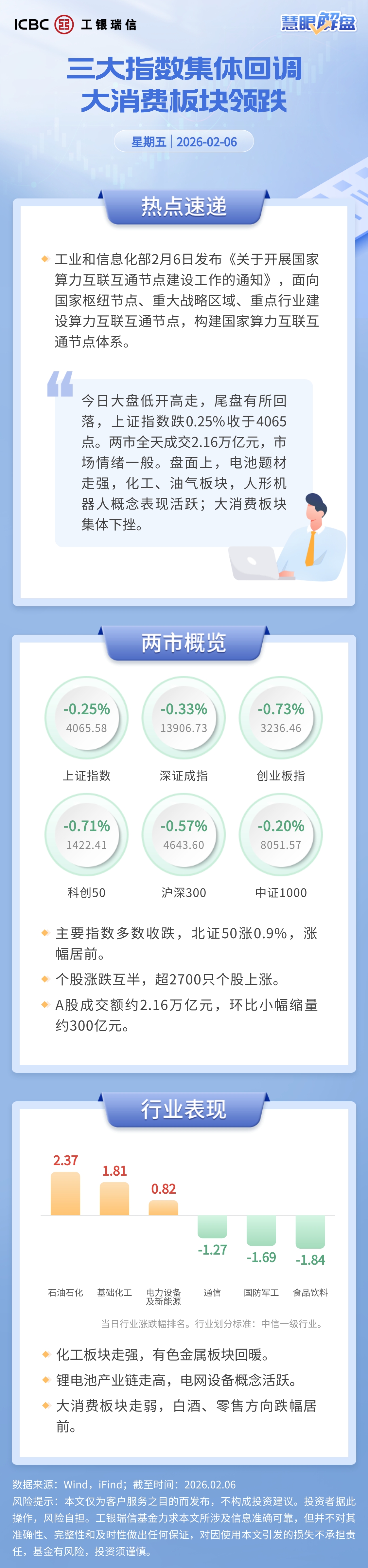 今日大盘低开高走,尾盘有所回落,上证指数跌0.25%收于4065点。两市全天成交2.16万亿元,市场情绪一般。盘面上,电池题材走强,化工、油气板块,人形机器人概念表现活跃;大消费板块集体下挫。