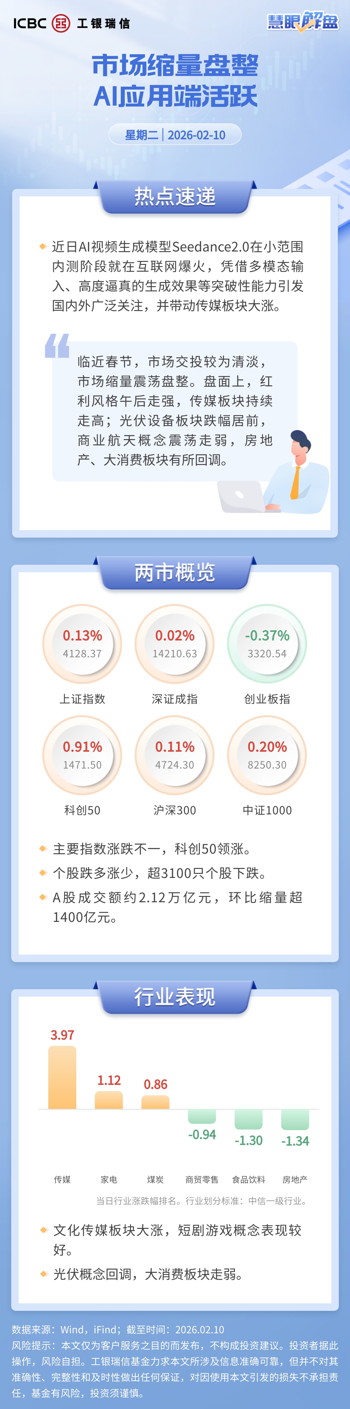 临近春节,市场交投较为清淡,市场缩量震荡盘整。盘面上,红利风格午后走强,传媒板块持续走高;光伏设备板块跌幅居前,商业航天概念震荡走弱,房地产、大消费板块有所回调。