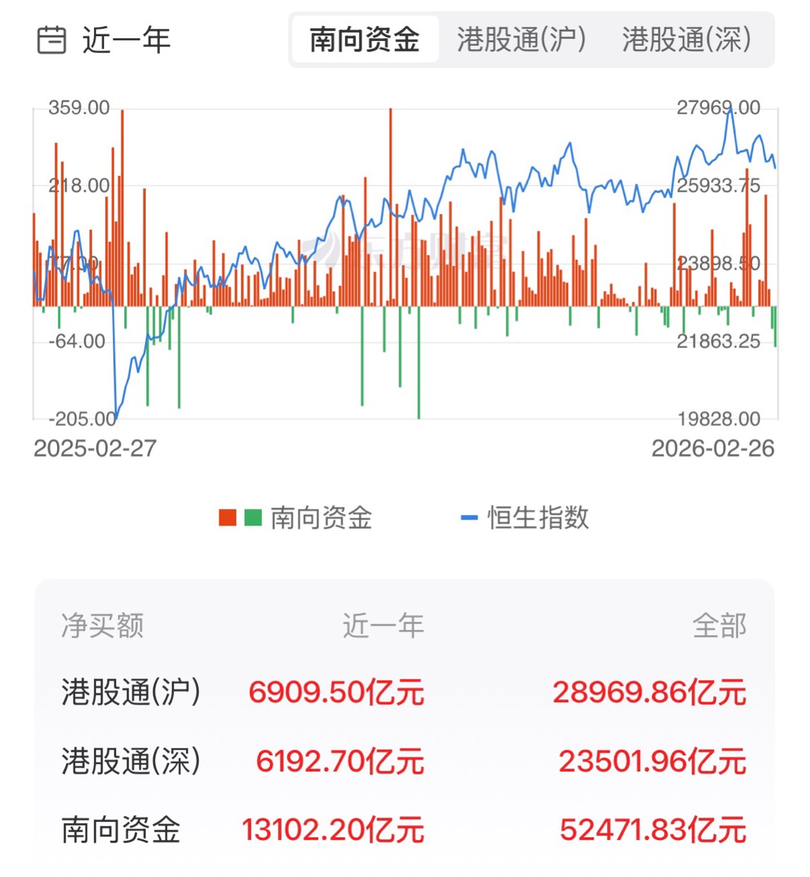 然而,持续的调整并不意味着希望的湮灭。恰恰相反,当悲观情绪被充分定价,一些积极的信号和长期的价值便开始浮现。最引人注目的是资金的“逆行者”。尽管市场震荡,但南向资金却呈现出坚定的“越跌越买”态势。数据显示,截至2026年2月26日,近一年来南向资金流入港股的资金累计已达13102亿元,规模与去年同期基本相当。与此同时,跟踪港股科技指数等相关ETF产品也获得了巨额资金的逆势净申购。这并非盲目抄底,而是内资对港股科技资产长期价值的认可,以及对自身定价权提升的自信。