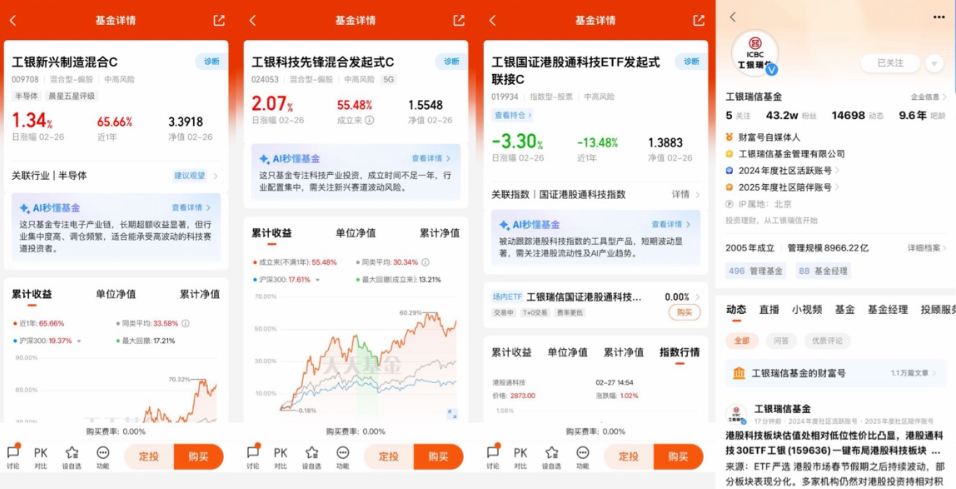 想明白这些,我就不再纠结要不要布局,而是开始找适合普通人的投资工具。我既没精力去研究每一只科技股,也不敢把钱都投在某一只股票上,毕竟市场波动太大,万一踩雷就亏惨了。后来我偶然了解到工银瑞信国证港股通科技ETF联接基金,不管是A类(019933)还是C类(019934),都是专门布局港股科技龙头的。它锚定的是国证港股通科技指数,代码980047,官方成分股都是行业里的硬角色,剔除了流动性差的股票,只选日均总市值最大的30只,前十大权重股占比接近80%,像腾讯、阿里、小米、中芯国际这些龙头都在里面,相当于一键打包了中国科技的核心力量,不用自己费心挑选。这只基金2024年5月28号正式成立,现在由赵栩和刘伟琳两位基金经理管理,2月刚增聘了刘伟琳加强投研,基金官方公布的最新数据显示,截至2月25号,单位净值是1.3892,近一年收益率-13.51%,虽然近期有波动,但作为场外基金,门槛很低,不用开通港股账户,几十块就能买,正好适合我这种没什么投资经验的新手。