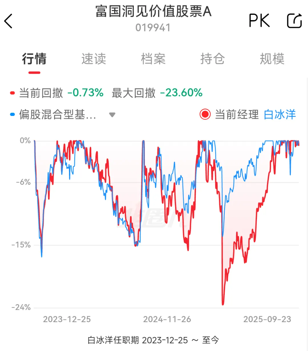 在风险控制方面,白冰洋管理的富国洞见价值回撤幅度相比偏股混合基金指数略大。