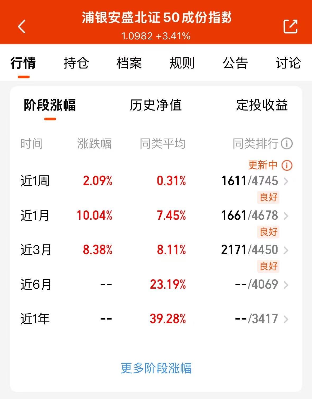 浦银安盛北证50不限额,今天大涨3.41%,是布局北交所的好选择$浦银安盛北证50成份指数C$
