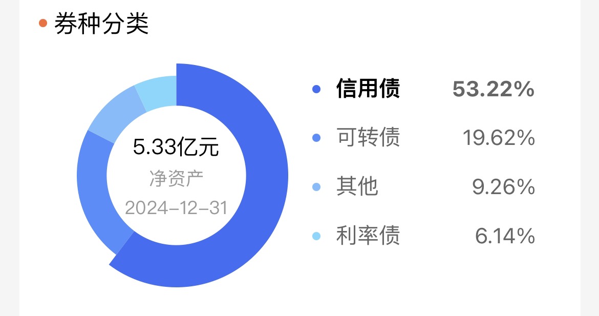记得去年底参加蚂蚁黑卡的线下活动时,几个小伙伴都在说“双债策略”这个新玩法。当时没太当回事,毕竟那时候A股市场还涨得火热,看不上这点收益,哈哈。可现在再看国泰这只一级债券基金,那配置,简直就是给眼下的行情量身定制的。信用债打底,稳稳当当的,就像给房子打了个坚实的基础;利率债稳盘,关键时刻能顶住;可转债冲锋,这就好比是手里攥着一把冲锋枪,有机会就冲一把。我仔细看了下最新的四季度持仓披露,这基金持有53.22%的信用债,6.14%的利率债,19.62%的可转债资产,还有9.26%的其他资产。
