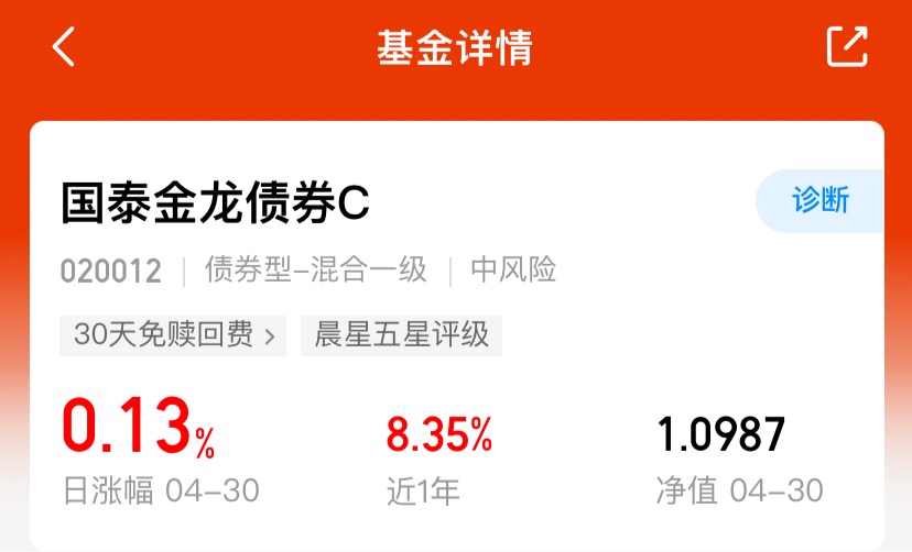 国泰金龙债券C(020012)优势显著,估计连涨三天了。产品策略上属于一级债基,信用债+可转债的组合比一般二级债基表现得更加稳定,在目前波动市场中能较好地平滑风险。从业绩表现看,成立以来累计净值增长可观,长期收益表现出色,过去两年业绩突出,在同类基金中排名靠前。上个交易日收蛋13个,近一年收益8.35%。此外,国泰基金管理公司实力强劲,投研团队经验丰富,能为基金运作提供有力支持,今天上车一笔,期待以后的表现!