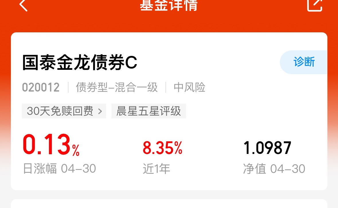 $国泰金龙债券C$ 它是一只一级债基,以中短久期信用债+可转债配置为主。相较于含权类固收+,金龙债采用的转债策略既能够一定程度上享受到权益市场的上涨幅度,同时下跌风险也相对可控,因此夏普比率、卡玛比率更高,风险收益性价比更高,产品的持有体验也由于绝大部分二级债基和超长久期利率债。业绩表现上看,近半年收了406个蛋,近一年更是涨幅了8.35%。后市来看,我国的经济复苏势在必行,五一黄金周期间的消费数据也能作证这一点,大盘指数上涨过程中转债也能跟随取得正向的回报,因此今天打算布局了。