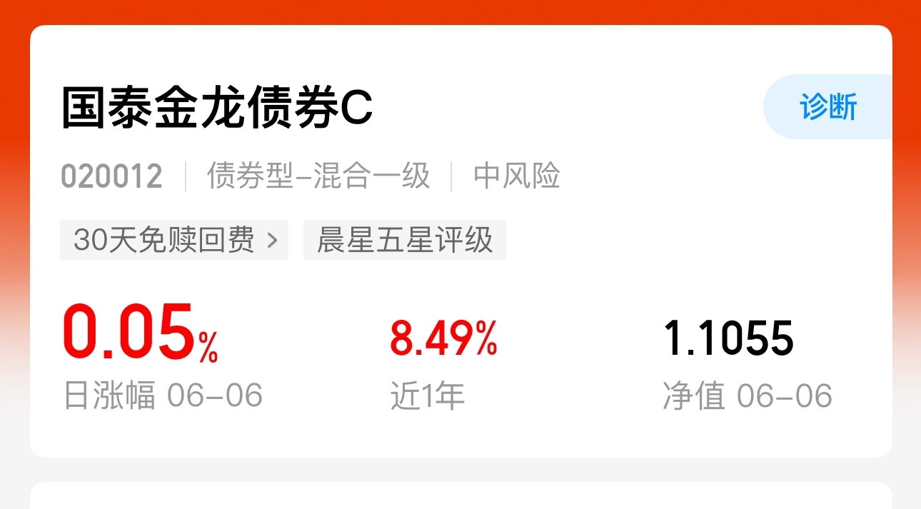 今天的行情真的很长时间没见到过了,股债双牛啊!准备加仓一笔国泰金龙债券C~一级债基,转债+信用债,既能守住债券的底仓收益,又能享受A股上升期的红利。从近期表现来看,它的走势比较稳健,已经连续四个交易日上涨,今日估计又能稳稳收蛋。近一个月累计收40个蛋,半年时间实现了收191个蛋,近一年收益率达到8.49%。该基金采用可转债和信用债相结合的策略,在控制风险的同时也具备一定的收益弹性。目前基金净值创出新高,历史最大回撤控制在2%以内,并在38个交易日内完成修复。整体来看,这类产品在债市中的表现相对突出,后续表现值得持续关注。