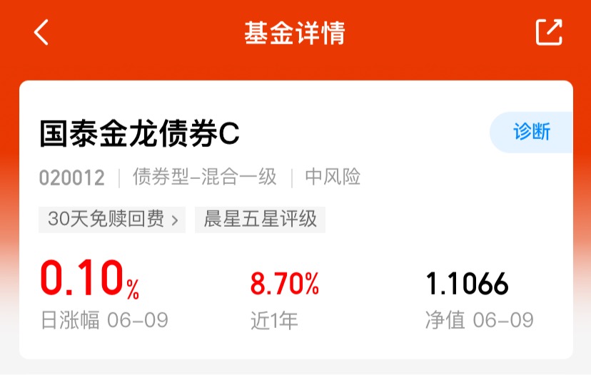 今天债市开盘表现不错,从当前趋势看,6月债市回暖概率较大。这段时间关注到国泰金龙债券C(020012),已经连涨5天,觉得比较值得分享。