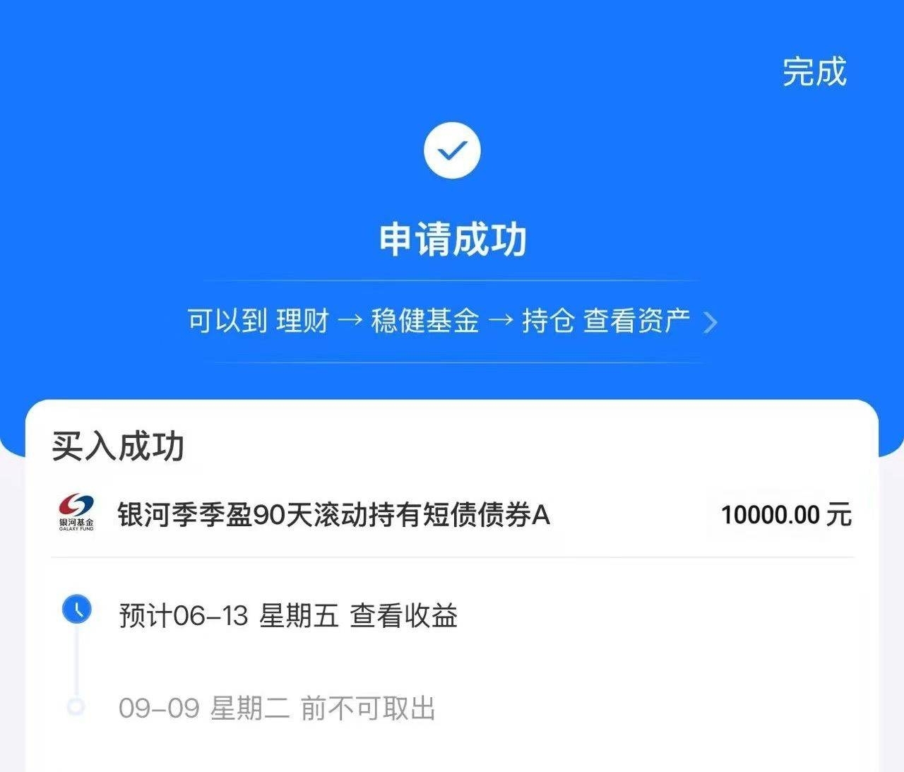 今天权益市场又跳水了,3400点压力还是比较大,不过尾盘还是拉伸了比较多,整体看还没有大幅调整的风险!随着央妈持续释放流动性,昨天放晴的债市今天表现稳定,利率债多云,信用债依旧晴天!不过今年来债市震荡还是偏震荡,刚刚我又发现$银河季季盈90天滚动持有短债A$ 这个稳健扛把子,今天又是稳稳1蛋,目前已经七天连涨,无论市场震荡都是逆势稳稳收蛋,持仓大仓位信用债,搭配了极小仓位利率债这样一个稳重求进组合,另外还有部分灵活配置仓位可布局转债增厚收益,稳定表现非常不错,近三月79蛋,近六月206蛋,同赛道近200只仅业绩稳居第三,近一年收益率3.87%,收益稳定性非常不错,适合做底仓长期配置,目前好不容易等到转债回调,后续转债起来又是大蛋,我非常看未来大蛋表现,今天提前布局一波,期待稳稳收大蛋!$安信稳健增值混合C$ $汇添富中短债E$ $金鹰添盈纯债债券C$