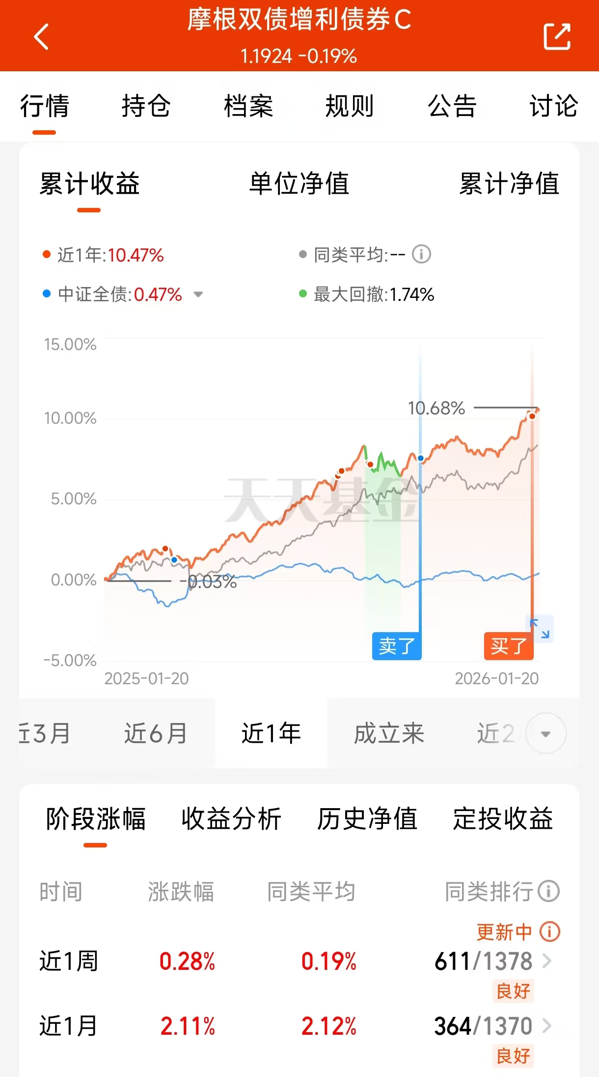现在这存款利息,是不是感觉存银行跟没存差不多?但市场一波动,又不敢轻易进场。最近这行情确实磨人,涨一天跌一天,主要原因还是经济复苏的路径不会太顺畅,市场需要时间来消化各种信息,加上外部环境还有不确定性,波动就难免了。这种时候,操作上建议别太激进,减少操作频率,增加一些稳健型资产的配置可能更合适。说到2026年的市场环境,我觉得"固收+"产品有几个值得关注的理由。首先从市场环境看,股市虽然长期有机会,但结构分化会很明显,整体可能是震荡上行的慢牛格局,而债市这边利率低位震荡,纯债的收益空间被压缩了。这种股债市场特点,正好让"固收+"产品能发挥股债跷跷板效应,通过股债搭配来平衡风险。其次从资产配置角度看,"固收+"产品不只是简单的股债搭配,还可以配置可转债这类资产。可转债有"债底保护+股性弹性"的特性,2026年可转债市场估值过高的情况有望缓解,配置价值会逐步显现,这和"固收+"追求稳健收益的目标高度契合。再加上现在无风险利率持续走低,存款利息越来越低,购买力缩水风险凸显,而"固收+"产品通过配置权益资产来增强收益弹性,正好能应对这种环境。这类产品就是典型的"固收+"策略,它的独特之处在于三重收益来源:债券资产、可转债和股票(10%以内),这三者搭配起来,争取比纯债更好的收益。和市场上其他10%股票仓位的产品比,比如永赢鑫享混合A,这个产品在回撤控制上表现更好,波动相对小一些,而且两天就涨了0.5%。这个产品就是$摩根双债增利债券C$(000378),还有个有意思的点,它的机构持有人比例较高。机构资金对这类产品要求很严格,既要收益又不能波动太大,他们愿意买说明产品在争收益的同时回撤控制做得不错。现在市场震荡加剧,想找机会又怕波动大的,可以关注下$摩根双债增利债券C$(000378),毕竟机构都认可了,而且现在这个时点布局,可能是个不错的机会。#暖阳创作计划#