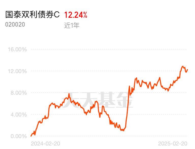 中午好朋友们,今天市场大分歧,目前市场还是在选择方向之中,昨天大涨的机器人也是出现了回落,强势的科技板块已经是高位了,所以我打算布局一些低位的,目前长债已经到了六十日线支撑出现反弹,我今天继续看好债市的反弹,今天已经出现探底回升的走势了,后续我继续看好债市创新高。我还是喜欢具有进攻性的债基,所以挖掘了一圈市场上的固收+,目前综合对比发现国泰双利债券 c 非常不错,昨天债市小幅回暖,昨晚收了25个蛋,可见进攻性极强,而且这几天市场回调的时候,抗跌性也是非常强,近一年涨幅超过十二个点,大幅跑赢了同类指数,位置还不错,这几天已经跌出来性价比了。看双利的权益仓位买的黄金股,黄金今年也是很强势的板块,上涨还没有继续,所以这只基今年应该会有不错的表现。今天继续入场吃肉$国泰双利债券C$