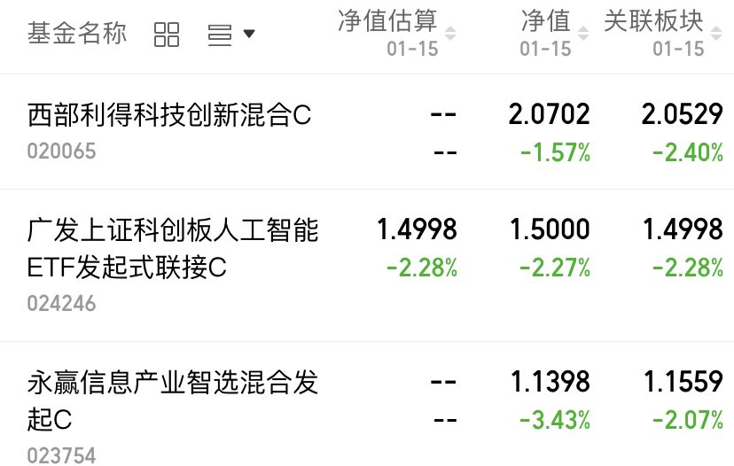A 股调整逢低加仓 AI 应用元年可期今日 A 股迎来调整,正好适合逢低补仓。“人工智能 +” 行动持续深化,明确支持 AI 在千行百业落地,2026 年被公认为 AI 应用投资元年$西部利得科技创新混合C(OTCFUND|020065)$下跌1.57%,$广发上证科创板人工智能ETF发起式联接C(OTCFUND|024246)$下跌2.27%,$永赢信息产业智选混合发起C(OTCFUND|023754)$下跌3.43%。