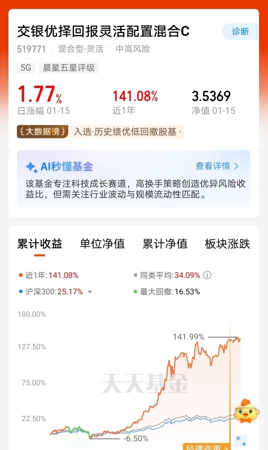 交银优择回报C作为中风险混合型灵活配置基金,1月15日日涨幅达1.77%,近期走势有亮点。该基金布局科技赛道,AI、半导体领域正逢技术迭代与产业政策支持的双重利好,消费板块也随内需回暖逐步发力,多元布局让资产配置更丰富,近一年涨幅也体现出布局的实际效果。
