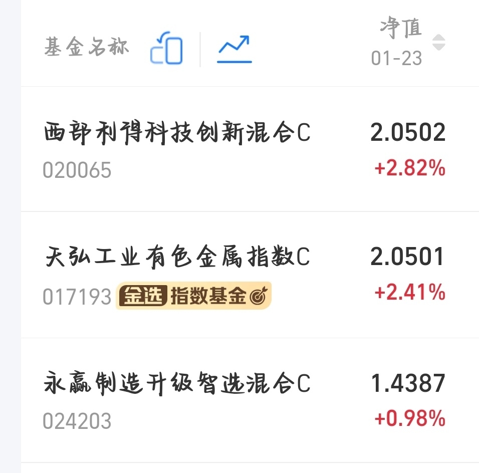 $天弘工业有色金属指数C$ 今天上涨2.41%