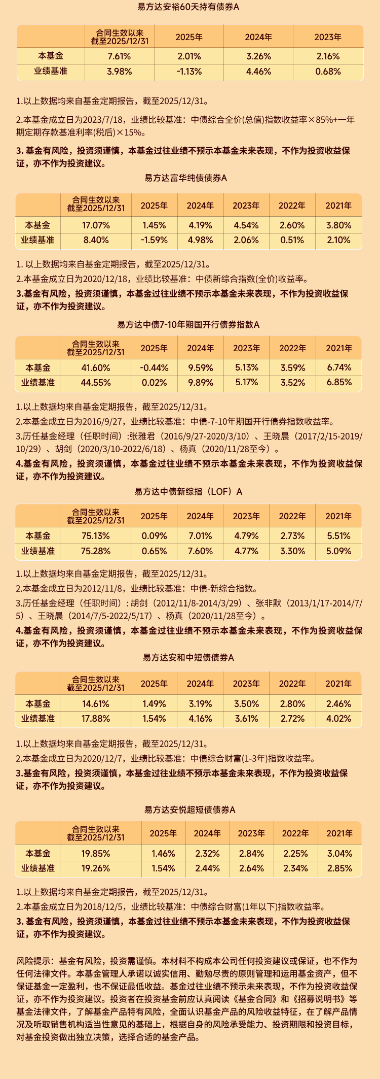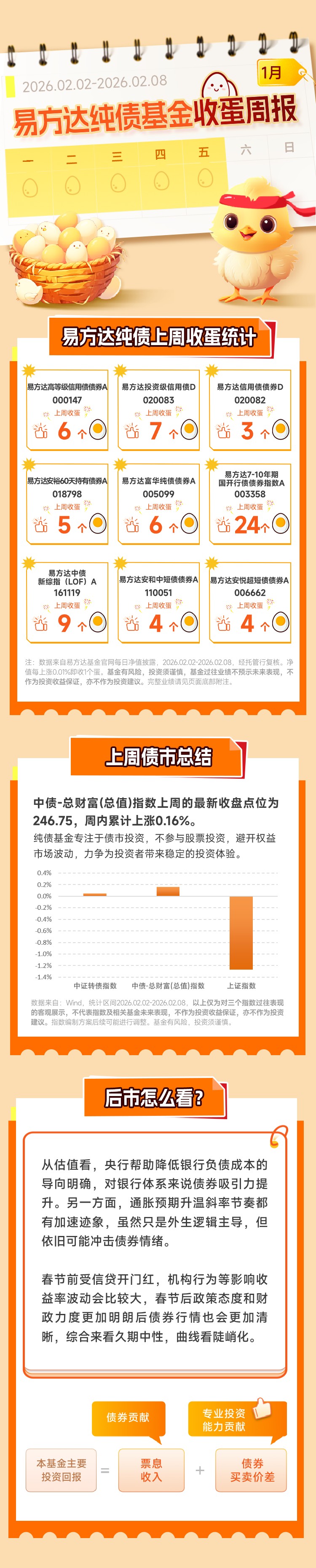 注:数据来自易方达基金官网每日净值披露,2026.02.02-2026.02.08,经托管行复核。净值每上涨0.01%即收1个蛋。基金有风险,投资须谨慎,基金过往业绩不预示未来表现,不作为投资收益保证,亦不作为投资建议。完整业绩请见页面底部附注。