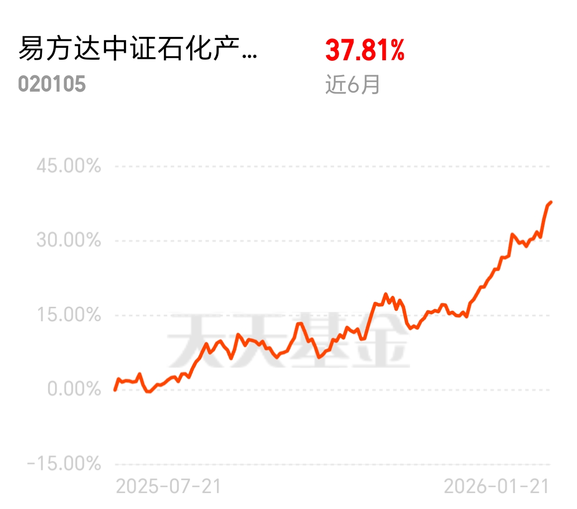 恒力荣盛等炼化龙头发力,石化产业链景气度回升,石油天然气领涨超联动,易方达中证石化产业 ETF 联接发起式 C 近 6 月 37.81%,三桶油 + 细分化工机会都想抓住,买石化产业全覆盖