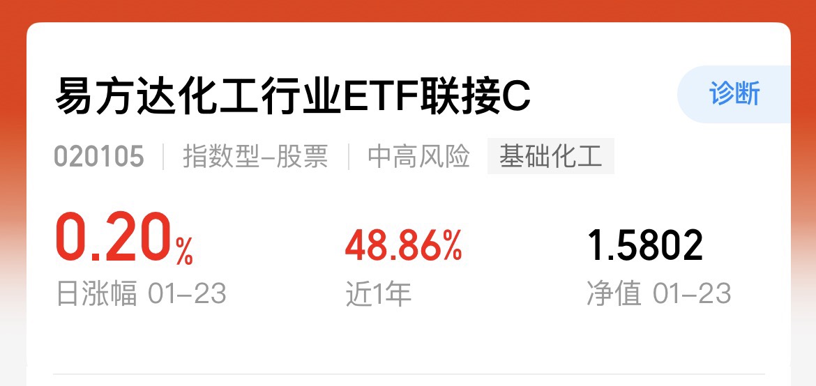 最近市场风格切换到还是太快了,化工迎来了上涨。今天市场还是有点震荡的,个股涨多跌少,但化工板块已经六连阳了,有望接棒成为最强的赛道$易方达化工行业ETF联接C$ 现在上车还是可以吃饭红利的吧