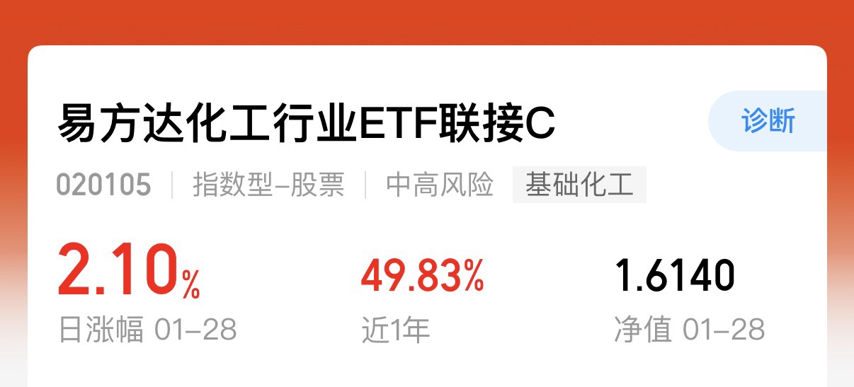 今天化工板块虽然有所波动,但是这一个方向有力好的推动当前的位置也是迎来一个周期的反弹,所以中长期来看行情趋势仍然是在的$易方达化工行业ETF联接C$ 这只基金持仓覆盖石油石化龙头覆盖面更广一些,所以它的上涨弹性也会更大