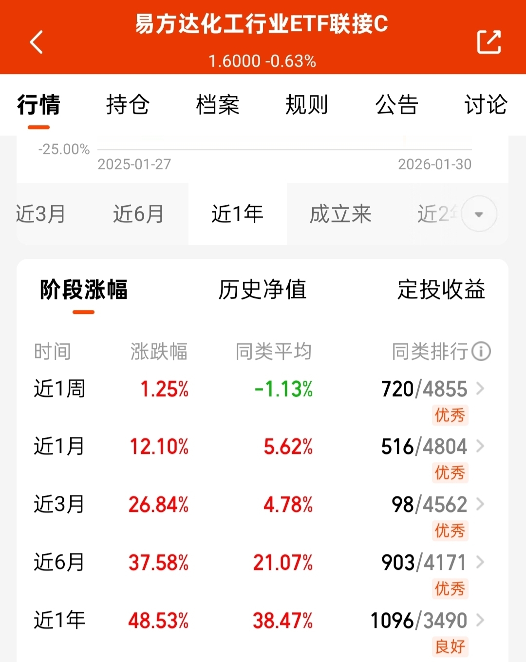$易方达化工行业ETF联接C$近一年涨幅超48%,业绩表现亮眼,持仓覆盖石油石化