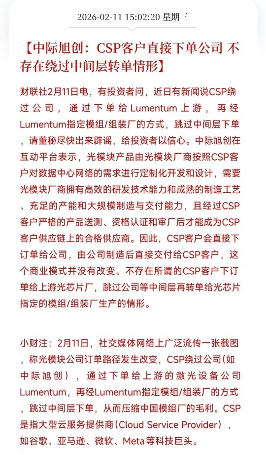 中际旭创出来辟谣了,CSP客户直接下单公司 不存在绕过中间层转单情形