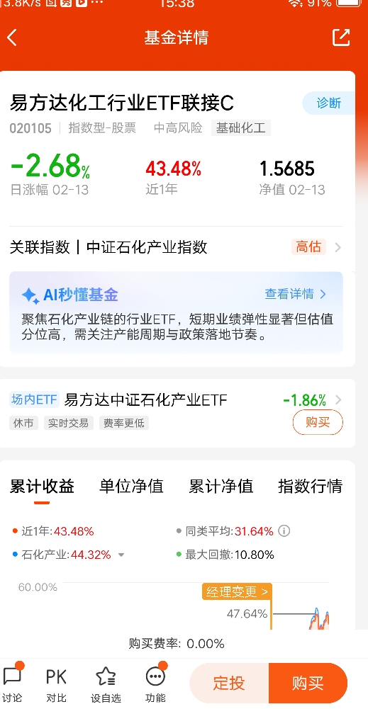 2026年我看好石油化工,由于本人所从事的职业是需要接触石油化工公司,属于它们的供应商,进入2026年以来,公司的订单业务明显与2025年同期相比高了一大截,所以我有理由相信石油化工已经度过了寒冬,重新恢复以往的产量指日可待,2026年我看好石油化工率先破冰。$易方达化工行业ETF联接C$ @易方达基金