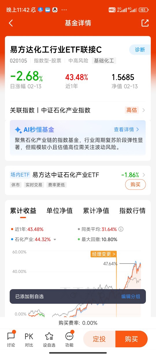* 分批买入,摊薄成本:化工行业波动较大,建议采用“分批买入”策略。首次布局配置资金的30%-50%,若净值回调超10%再补仓,以平衡周期波动风险。