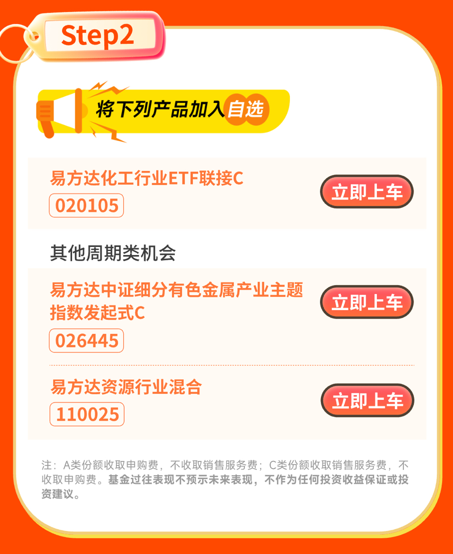 相关产品直通车→$易方达化工行业ETF联接C(OTCFUND|020105)$$易方达中证细分有色金属产业主题指数发起式C(OTCFUND|026445)$$易方达资源行业混合(OTCFUND|110025)$