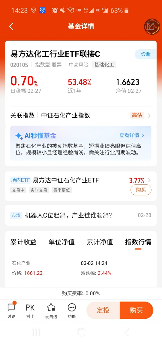 一键布局化工板块,我正在密切关注:$易方达化工行业ETF联接C(OTCFUND|020105)$,本基金紧密跟踪石化产业指数,覆盖能源、化工龙头企业,今年以来上涨了16.53%,值得配置。@易方达基金