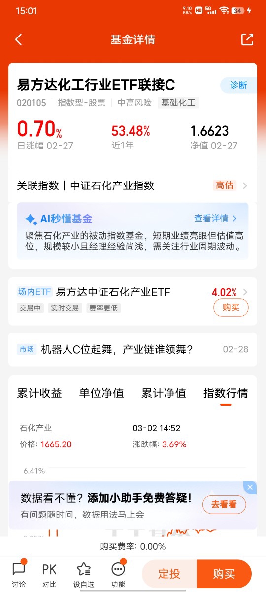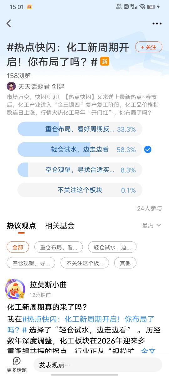 我在#热点快闪:化工新周期开启!你布局了吗?# 选择了“轻仓试水,边走边看”。近期市场对化工新周期的预期持续升温,从行业数据来看,部分化工品价格触底回升,企业盈利边际改善,板块整体修复趋势明显,这让我认为化工存在值得参与的结构性机会。但我始终认为,投资不能只看机会,更要敬畏风险。化工板块强周期、高波动的属性没有改变,即便趋势向好,中途也大概率出现震荡回调,重仓入场很容易面临较大浮亏,影响长期持有心态。结合自身风险偏好,我选择轻仓买入易方达化工ETF联接C,既不错过这一轮周期启动的红利,也将回撤风险控制在较低水平。我不会追求短期快速获利,而是以中长期视角边走边看,持续跟踪行业景气度变化,根据市场实际走势动态调整持仓,不激进追高、不恐慌割肉,用稳健的方式布局,让投资更从容、更可控。