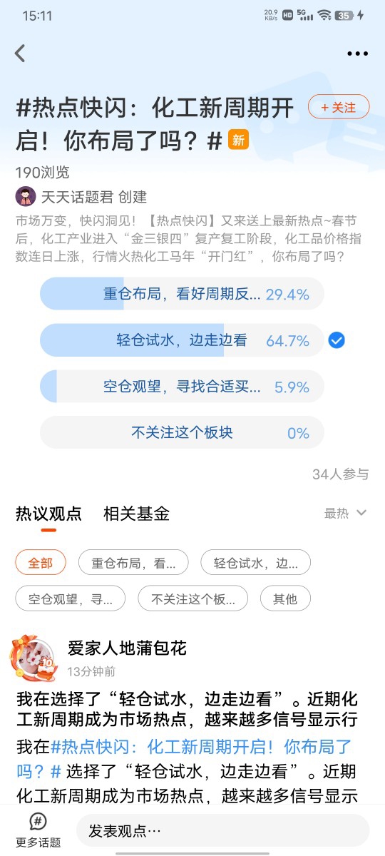 我在#热点快闪:化工新周期开启!你布局了吗?# 选择了“轻仓试水,边走边看”。