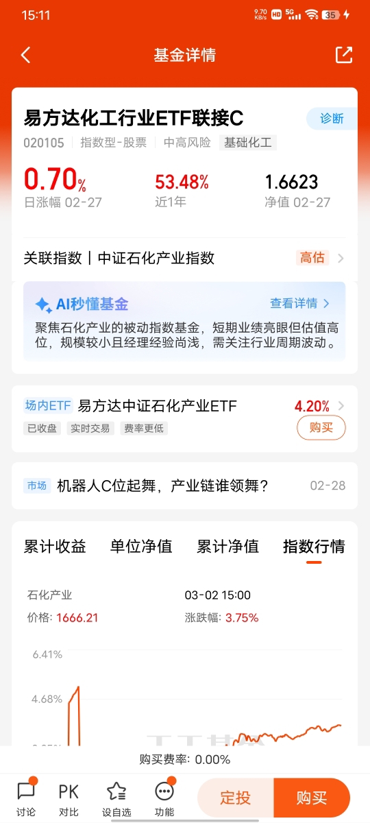 易方达化工ETF联接C 在化工新周期开启的热点讨论下,我选择轻仓试水,边走边看。我看好化工板块本轮周期反转的长期逻辑,行业经过供给侧优化后,竞争格局更健康,随着经济复苏推进,化工品需求有望持续回升,板块估值修复空间较大。但同时我也清醒认识到,短期市场依旧存在不确定性,国际形势、油价波动、资金轮动都可能造成板块震荡,盲目重仓并非明智之举。为了平衡机会与风险,我选择轻仓配置易方达化工ETF联接C,依托基金工具分散风险,轻松布局化工赛道。轻仓让我拥有更平和的投资心态,不会被短期涨跌左右情绪,也有足够的余地根据市场变化调整策略。我会持续关注行业核心数据,边走边看、顺势而为,在确认新周期行情具备强持续性后,再合理提升仓位,既抓住化工周期机遇,也牢牢守住投资风险底线,做理性、从容的普通投资者。
