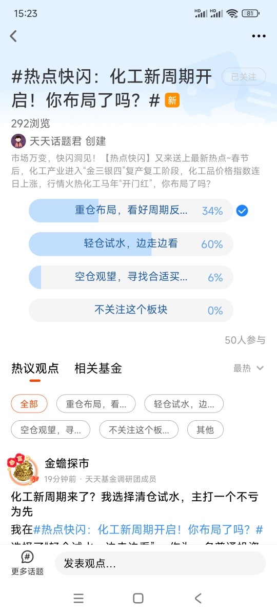 我在#热点快闪:化工新周期开启!你布局了吗?# 选择了“重仓布局,看好周期反转”,最近化工板块一路走强,核心逻辑就一个:需求端双轮驱动,传统复苏+新经济爆发,两头都给力。