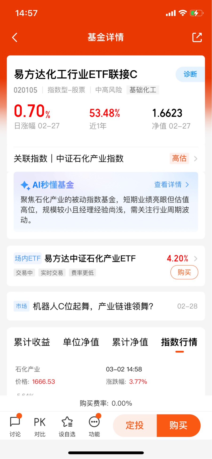 我选择轻仓试水,边走边看。化工这波行情我真的不想错过,但也不想盲目操作,所以我打算利用易方达化工行业ETF联接C(020105)轻仓试水,边走边看。