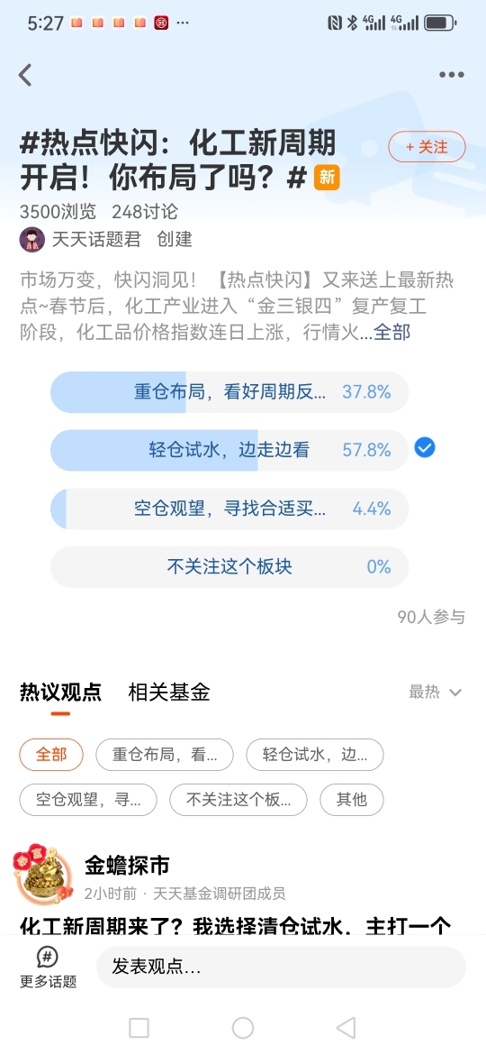 我在#热点快闪:化工新周期开启!你布局了吗?# 选择了“轻仓试水,边走边看” 。