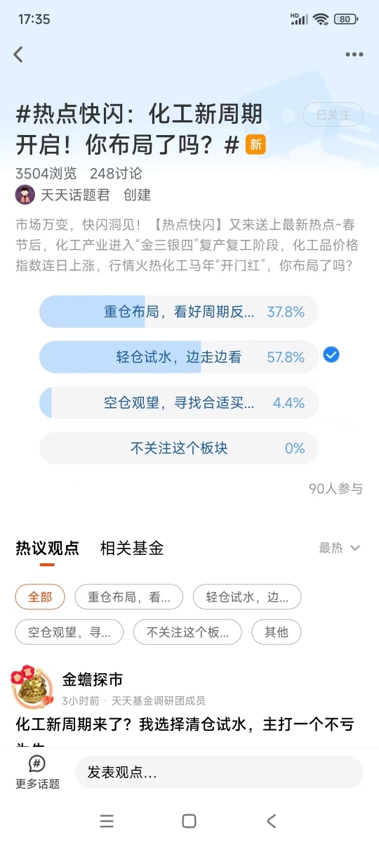 #热点快闪:化工新周期开启!你布局了吗?# 我在#热点快闪:化工新周期开启!你布局了吗?# 选择了“轻仓试水,边走边看”,化工板块,就是机构投资者中线底仓的重要配置方向,最佳策略就是,边走边看、分批布局。
