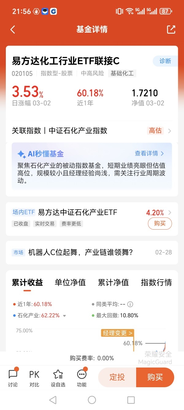 化工板块马年表现亮眼,本质是周期底部反转与成长逻辑共振的结果。从周期视角看,化工品价格指数触底回升,企业盈利拐点已现,2025年前三季度净利润同比增长7.5%,行业进入盈利修复通道。需求端,海外化工产能加速退出,国内“反内卷”政策推动供给优化,而新能源、AI算力等新质生产力需求持续释放,形成长期增长动能。政策层面,国内稳增长与海外地缘风险共同推升化工战略地位,磷、氟等资源品受政策倾斜,龙头企业定价权强化。易方达化工ETF以低费率、高纯度著称,管理费仅为同类1/3,且跟踪指数剔除尾部产能,聚焦万华化学、华鲁恒升等具备全球竞争力的龙头。当前板块处于“戴维斯双击”初期,ETF通过一键配置分散风险,避免个股波动干扰,尤其适合中长期持有分享行业复苏红利。