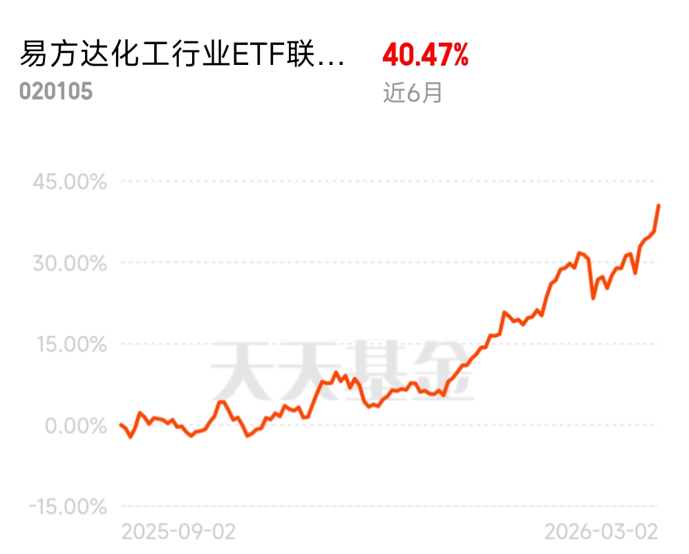 基于对化工新周期的坚定看好,我选择重仓易方达化工ETF联接C,核心原因有三点。第一,指数化布局精准覆盖行业龙头,一键分享板块整体上涨红利,避免个股踩雷风险,充分享受周期反转与龙头溢价。第二,C类份额持有成本更友好,适合中长期布局,交易便捷、费率透明,无论是长期持有还是波段操作都很适配。第三,易方达作为头部基金公司,指数管理能力突出,跟踪误差小,能高效贴合指数表现,让投资者稳稳抓住行业贝塔收益,同时分享新材料、高端化工带来的阿尔法机会。