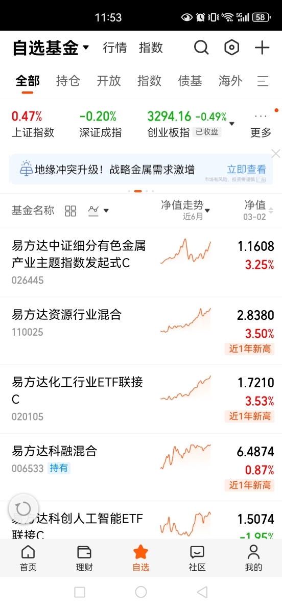 我在#热点快闪:化工新周期开启!你布局了吗?# 选择了“轻仓试水,边走边看” ,因为我的投资策略始终以稳健为主,优先考虑风险控制,再追求收益增长。虽然化工马年迎来“开门红”,行情火热,但市场不确定性依然较多,无论是供需格局、政策变化,还是成本波动、海外风险,都可能影响行情走势。盲目重仓追高,一旦市场出现反转,将面临较大损失;而轻仓试水既能参与短期行情,分享价格上涨带来的收益,又能将风险控制在可承受范围内。同时,通过边走边看,密切跟踪市场动态,及时调整投资策略,既能规避潜在风险,也能在市场趋势明确后精准加仓,实现稳健盈利。$易方达化工行业ETF联接C$