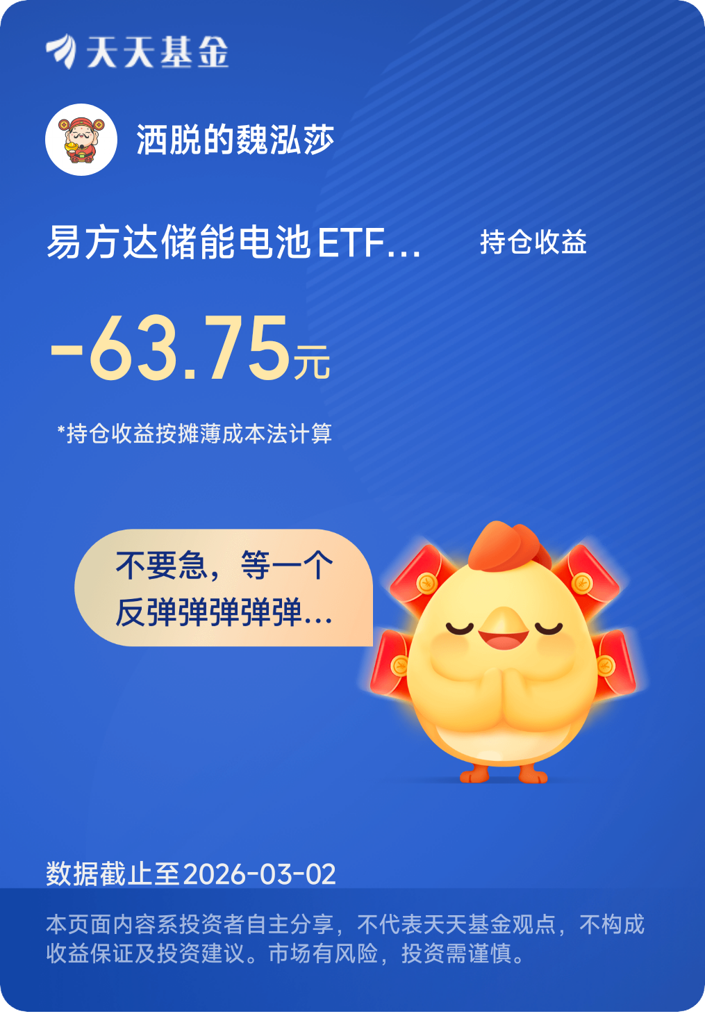 站在当前时点,化工新周期的逻辑逐步兑现,但道路注定曲折。我始终相信,投资不是比谁胆子大,而是比谁更理性、更有耐心。选择轻仓试水,边走边看,配置易方达化工ETF联接C,是兼顾机会与风险的最优解。未来我会持续跟踪行业数据,坚守投资纪律,不追涨、不杀跌,在周期波动中稳步布局,静待化工新周期的花开结果。