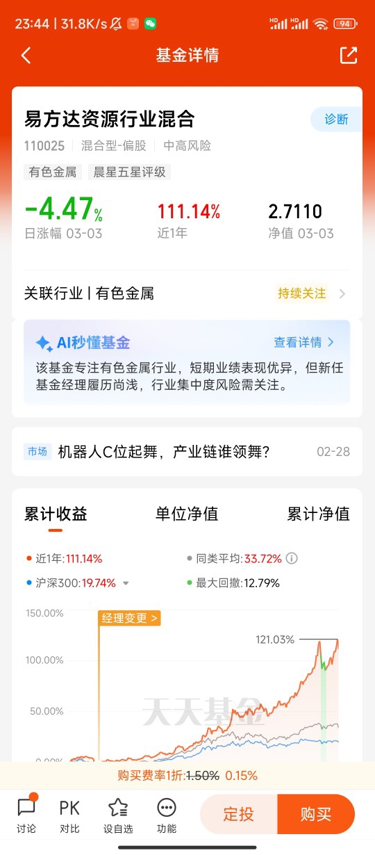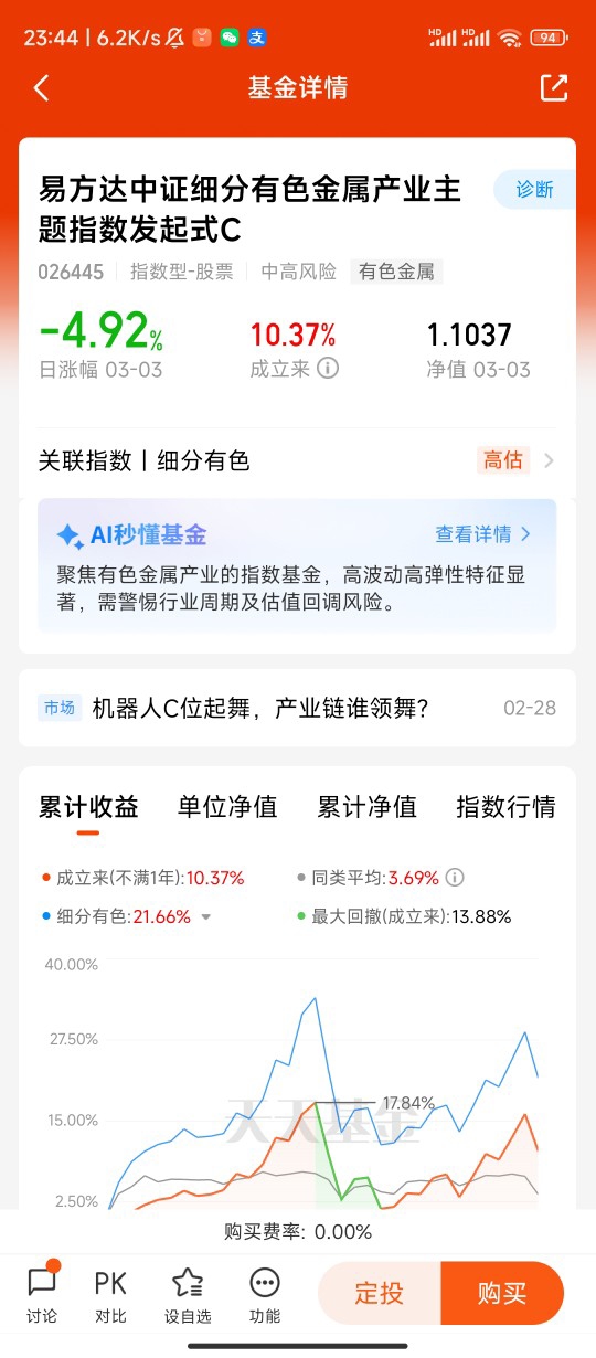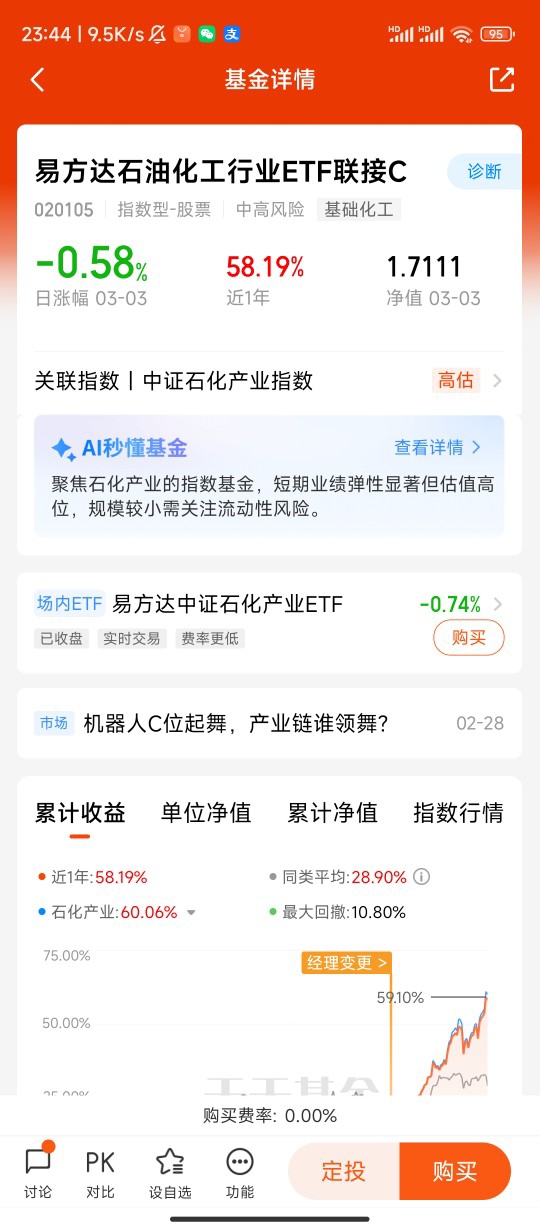选择易方达化工ETF联接C,是因为它非常契合轻仓布局的需求。这只基金跟踪化工行业指数,一键覆盖产业链上下游龙头企业,避免了单只股票踩雷的风险,分散效果好。对于没时间研究个股、看不懂复杂财报的普通投资者来说,ETF联接基金简单透明,走势紧跟行业整体,能充分分享板块复苏的红利。C类份额没有申购费用,持有成本更低,适合短期波段操作和灵活调整仓位,和我“边走边看”的策略高度匹配。